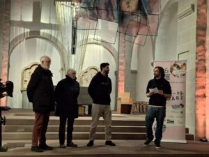 Matthias Zimoch von der Servicestelle für Antidiskriminierungsarbeit eröffnete den Abend mit einer Einführung in die Idee und Entstehung der Ausstellung. Anschließend sprach er mit Sherwan Weli, ehemaliger Projektteilnehmer und heute Sozialarbeiter der Stadt Paderborn.