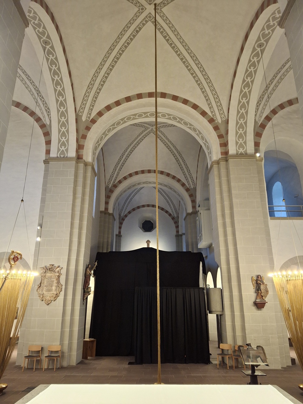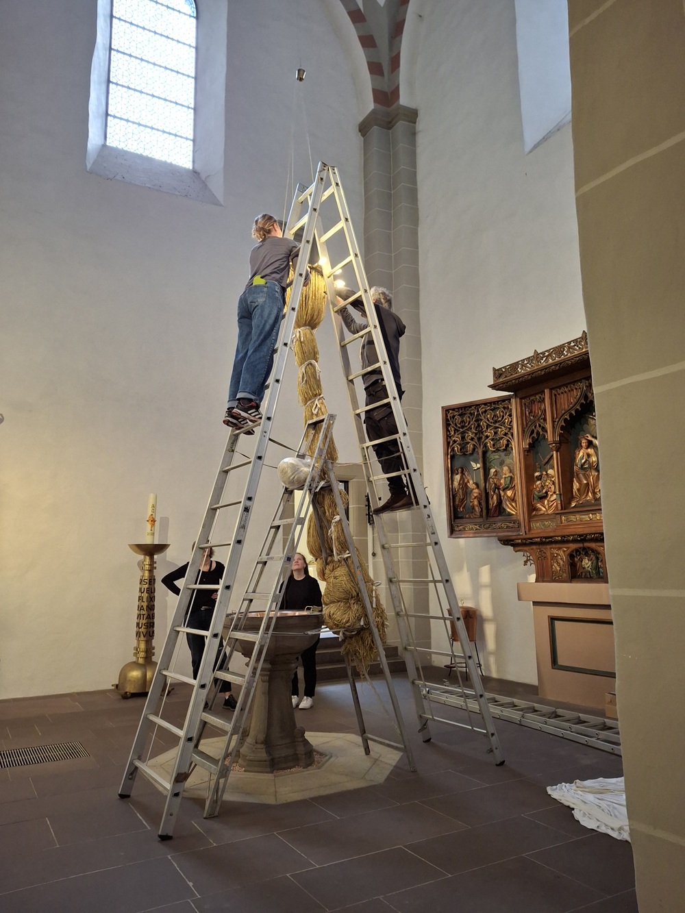 Im Altarraum ist zudem eine textilkünstlerische Installation der Kunstgruppe tx02 unter dem Titel „himmlisch berührt“ zu entdecken.
