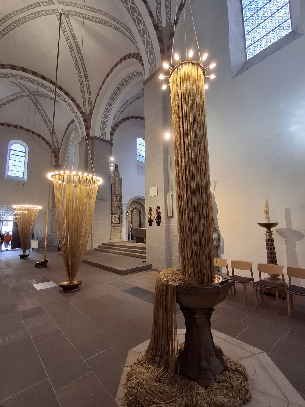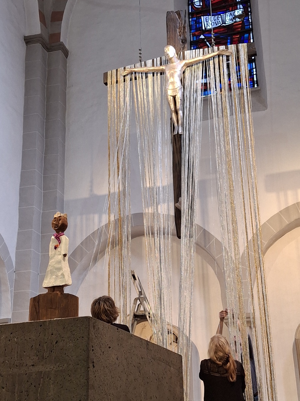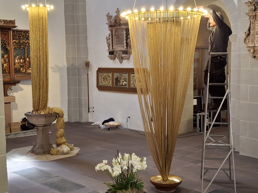 Anschließend eröffnete sich den Besucherinnen und Besuchern im Altarraum eine textilkünstlerische Installation der generationenübergreifenden Kunstgruppe Tx02 unter dem Titel „Lichtregen – himmlisch berührt“. Aus großformatigen Bodenschalen, die an Parabolspiegel oder auch an übergroße Hostienschalen erinnerten, und aus zwei großen Kelchobjekten stiegen unzählige goldene Fäden Richtung Decke auf. Ihr glitzerndes Schimmern erzeugte ein paradiesisches Leuchten, das den Blick fing und weiterleitete, einerseits auf das Taufbecken, andererseits zum Altarraum. Denn auch vom Taufstein stiegen goldene Strahlen auf, flossen aber auch noch aus dem Becken heraus und ergossen sich über den Kirchboden. Und auch im Altarraum stiegen intensive Strahlenbündel auf. Sie reichten bis zum Querbalken des Kreuzes und hoben den silbernen Christus-Korpus durch ihr Schimmern hervor. Die Kunstinstallation wollte das Gefühl des Verbundenseins zwischen Himmel und Erde bzw. Gott und den Menschen erzeugen. Die goldene Farbe zweite das Besondere, Wundervolle.