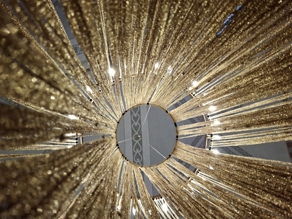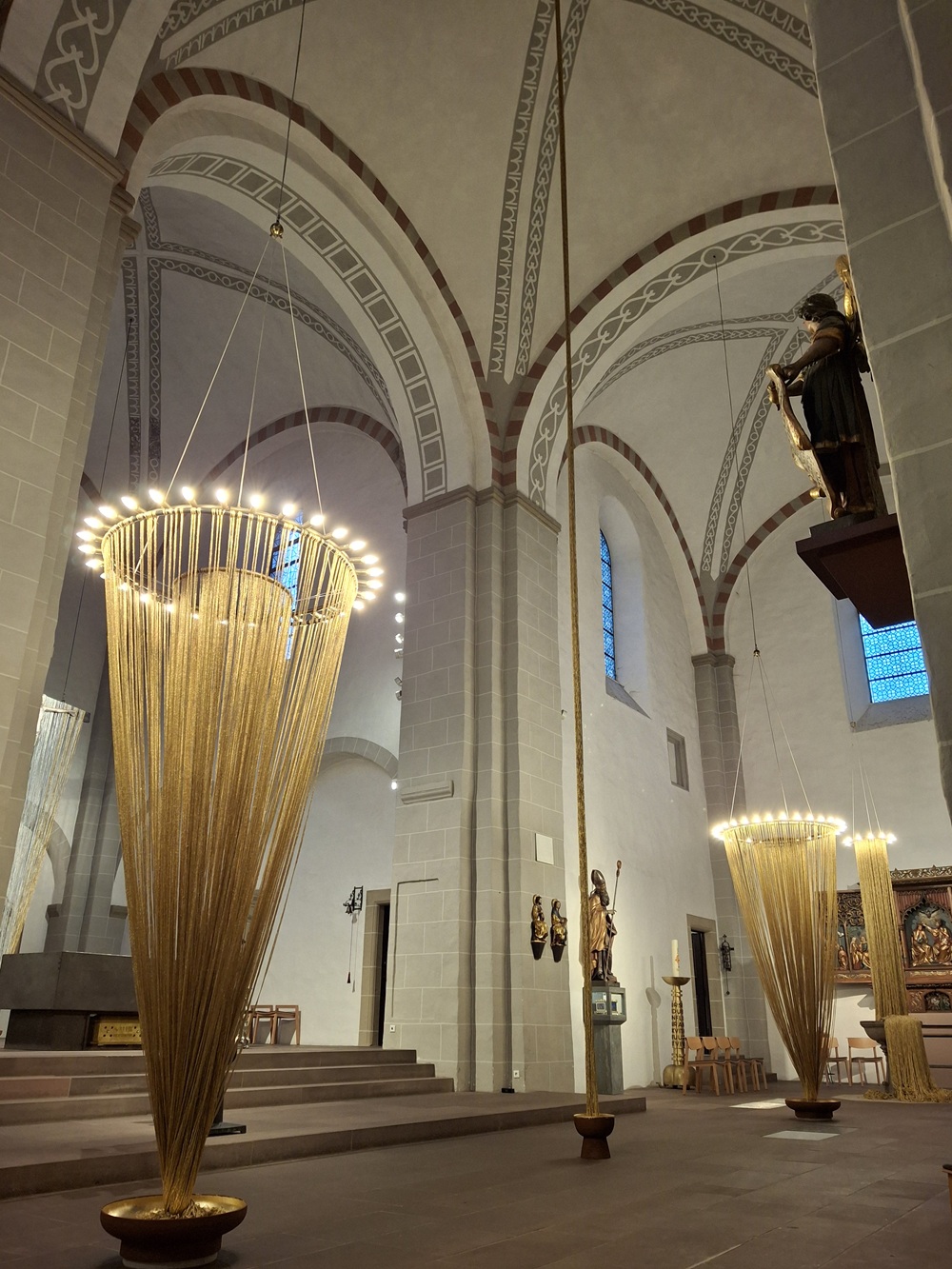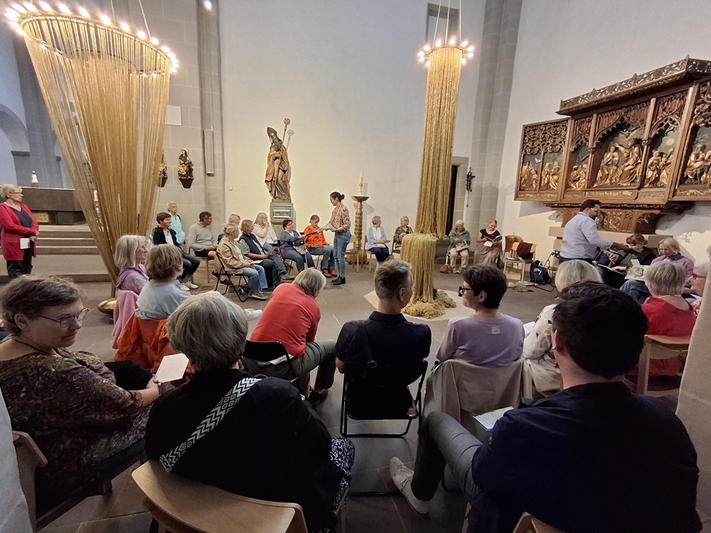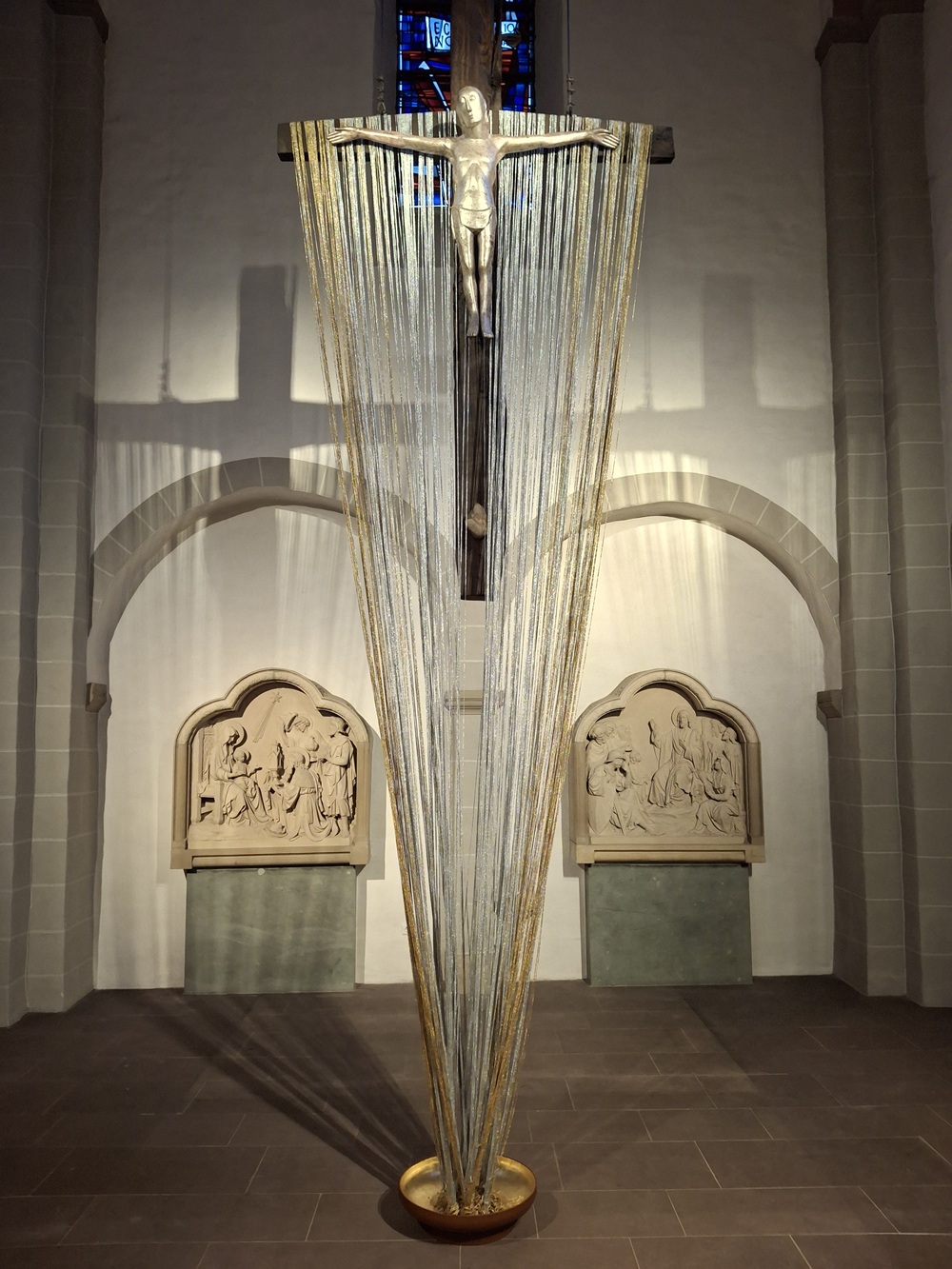Anschließend eröffnete sich den Besucherinnen und Besuchern im Altarraum eine textilkünstlerische Installation der generationenübergreifenden Kunstgruppe Tx02 unter dem Titel „Lichtregen – himmlisch berührt“. Aus großformatigen Bodenschalen, die an Parabolspiegel oder auch an übergroße Hostienschalen erinnerten, und aus zwei großen Kelchobjekten stiegen unzählige goldene Fäden Richtung Decke auf. Ihr glitzerndes Schimmern erzeugte ein paradiesisches Leuchten, das den Blick fing und weiterleitete, einerseits auf das Taufbecken, andererseits zum Altarraum. Denn auch vom Taufstein stiegen goldene Strahlen auf, flossen aber auch noch aus dem Becken heraus und ergossen sich über den Kirchboden. Und auch im Altarraum stiegen intensive Strahlenbündel auf. Sie reichten bis zum Querbalken des Kreuzes und hoben den silbernen Christus-Korpus durch ihr Schimmern hervor. Die Kunstinstallation wollte das Gefühl des Verbundenseins zwischen Himmel und Erde bzw. Gott und den Menschen erzeugen. Die goldene Farbe zweite das Besondere, Wundervolle.